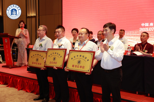 丁铭、姚兆春共同为商会成立揭牌;丁铭、卞文佐、陈海兵等领导为商会领导班子授牌。