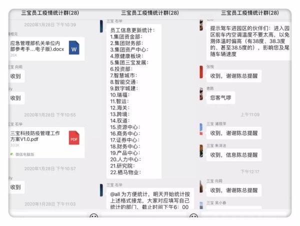 三宝科技防疫管理工作领导小组建立信息统计及报备制度,把员工健康和安全放在第一位,公司范围内执行“日报告”、“零报告”制度,每日汇总统计全国各地三宝人防疫情况。此外,三宝科技严格加强园区人员进出管理、园区消毒、车辆管理、食堂咖啡厅管理,持续执行至疫情解除,确保各项防控措施落细落小落实,把安全防疫做到极致。