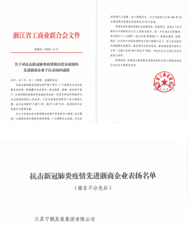 最近,浙江省工商联表彰了一批抗击新冠肺炎疫情先进浙商企业,江苏省南京市总商会副会长单位、南京市金华商会会长单位、江苏宁枫发展集团有限公司榜上有名。在2020年抗击新冠肺炎疫情中,宁枫发展集团积极履行社会责任,先后向抗疫一线单位捐款、捐物50多万元。