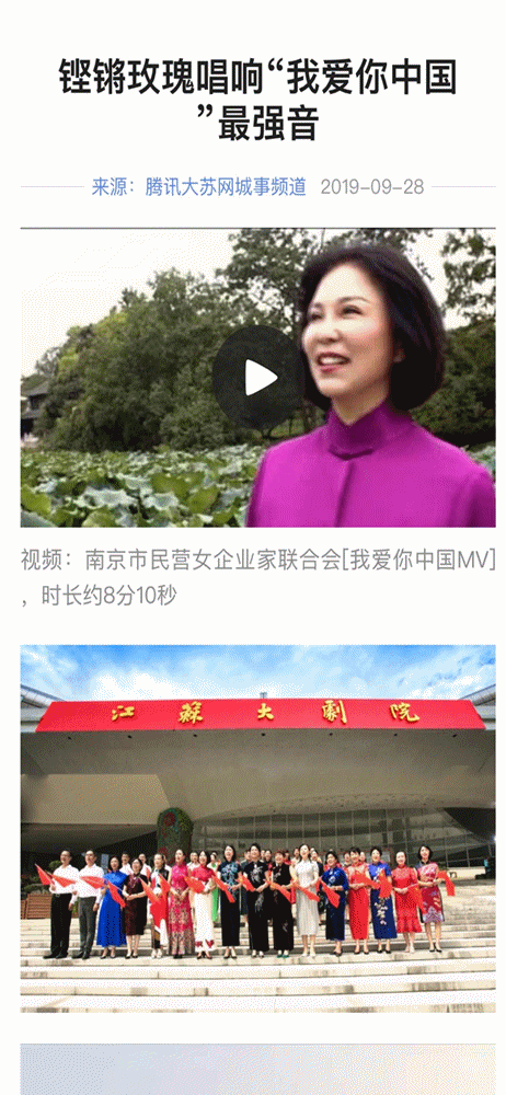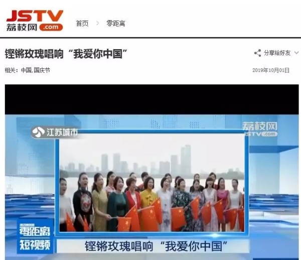 当晚,当人们还沉浸在国庆大阅兵的无比自豪中,陶醉在南京玄武湖绚烂的烟花和令人啧啧称奇的无人机表演时,女企姐妹们惊喜地看到江苏电视台零距离的压轴新闻即女企联为国庆献礼片《我爱你中国》,报道说:“女企业家以歌唱的方式为祖国庆生,经过数月筹备,精心拍摄制作了大型MV——《我爱你中国》,这个MV以歌唱者的爱国情怀为主线,串联了《我爱你中国》、《茉莉花》等五首不同风格、不同时期的经典歌曲,以联唱的方式,既回顾历史,又表达对祖国的热爱。”