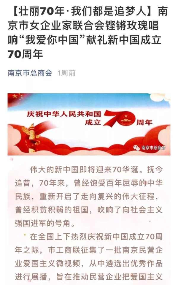 国庆前夕南京市总商会将我会献礼片作为优秀作品在其公众号重点展播,旨在推动民营企业把把爱国主义精神融入到企业文化塑造以及企业发展过程中,彰显新时代新宁商风采。