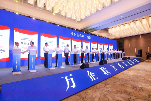 (2020年8月11日,全省“万企联万村共走振兴路”行动现场推进会议上,40组村企代表全省首批2834个村企合作项目现场集中签约。)