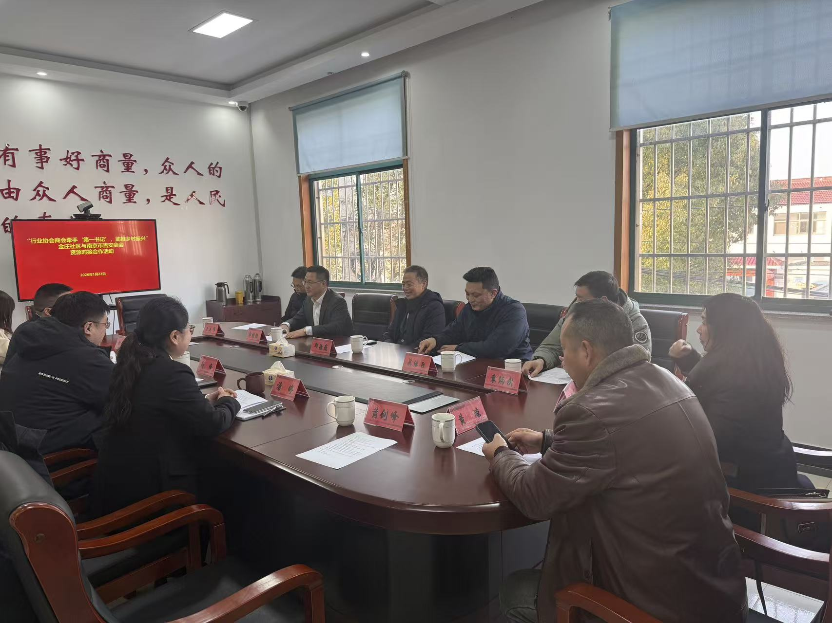 1月23日下午,经市委宣传部派驻程桥街道金庄社区第一书记赵乘水对接联系,南京市吉安商会来到程桥街道金庄社区,开展“行业协会商会牵手‘第一书记’,助推乡村振兴”主题对接活动,旨在通过资源对接与务实合作,为乡村产业发展注入新动能。市工商联二级巡视员、市总商会党委书记郑德巍,市总商会党委专职副书记李友伟,市委社会工作部行业协会商会处吴继飞,南京市吉安商会会长郭枧根,南京市吉安商会秘书长袁爱萍,程桥街道办事处副主任靳峰,金庄社区党总支书记潘婷及驻村第一书记赵乘水等参加活动。