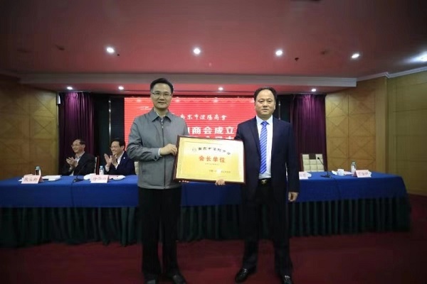 顾万峰、徐华勤为南京市溧阳商会揭牌,毛卫华为当选会长丁全炳授牌。